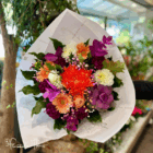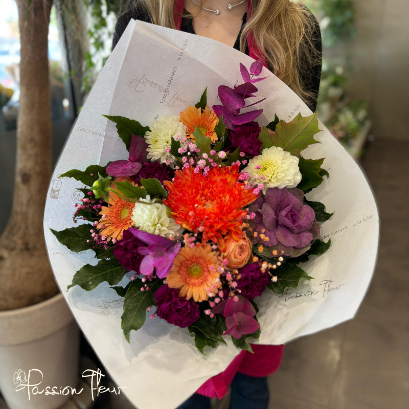 Offrez un souffle de gaieté avec le bouquet Crépuscule, une composition lumineuse aux fleurs orangées, violettes et crème.