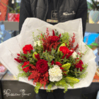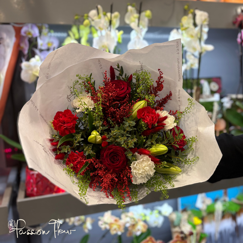 Composé de roses rouges profondes, de fleurs aux textures riches et de feuillages délicatement structurés, il incarne la passion sincère, la chaleur et l’attachement véritable.